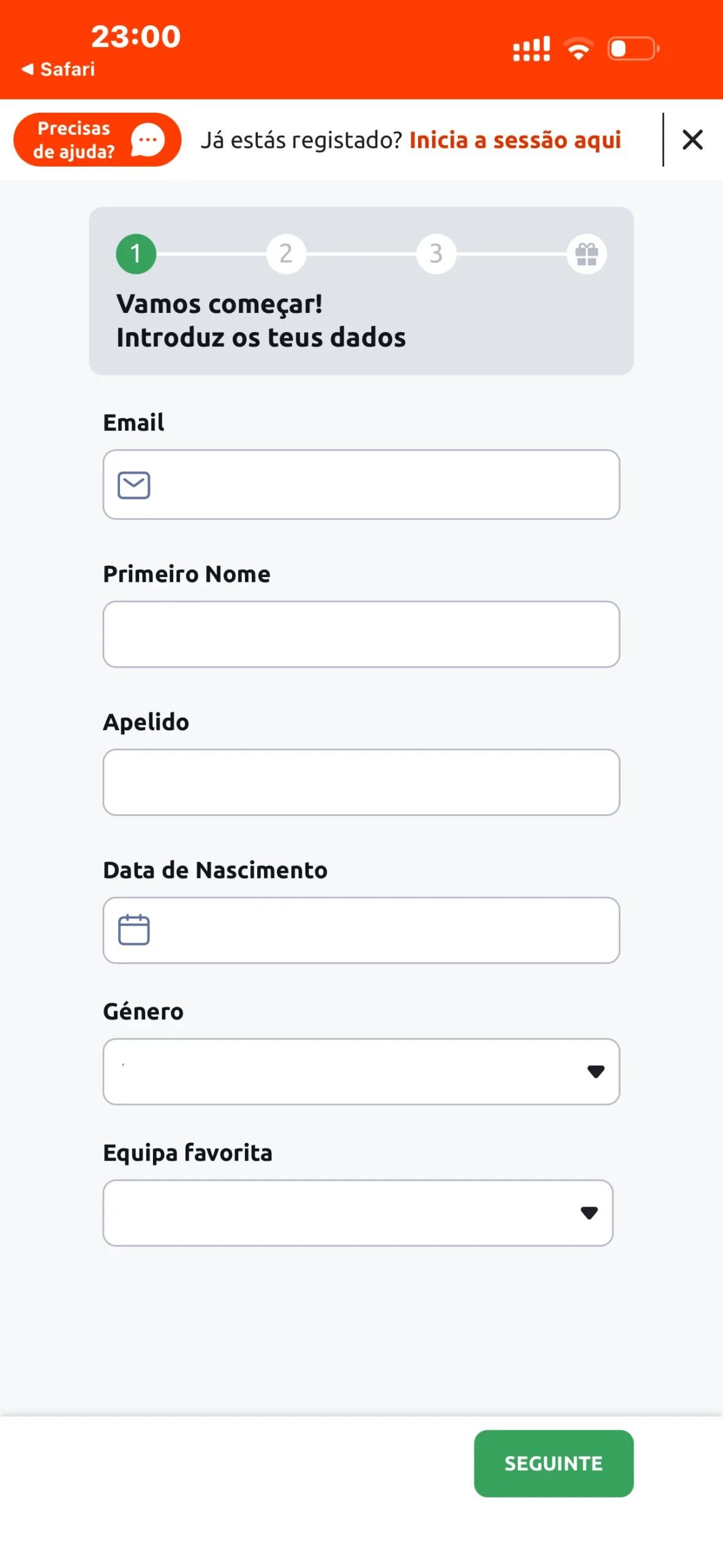No primeiro ecrã, preenche o formulário com: Email; Primeiro Nome; Apelido; Data de Nascimento; Género; Equipa Favorita.