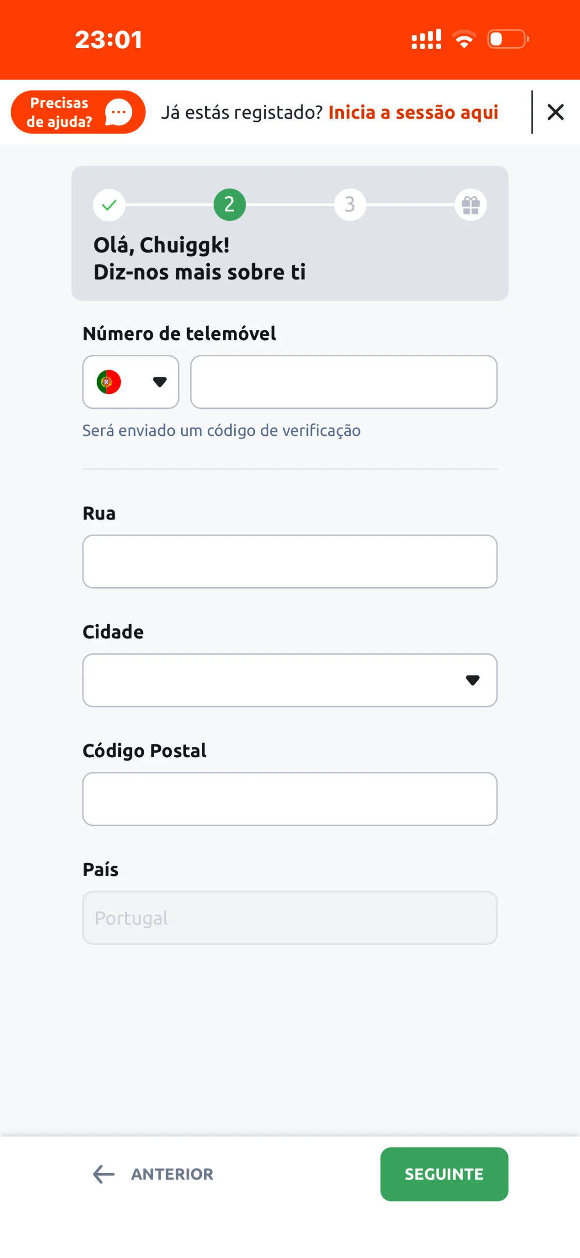 No ecrã seguinte preenche: Número de telemóvel (Será enviado um código de verificação); Morada e Código Postal;