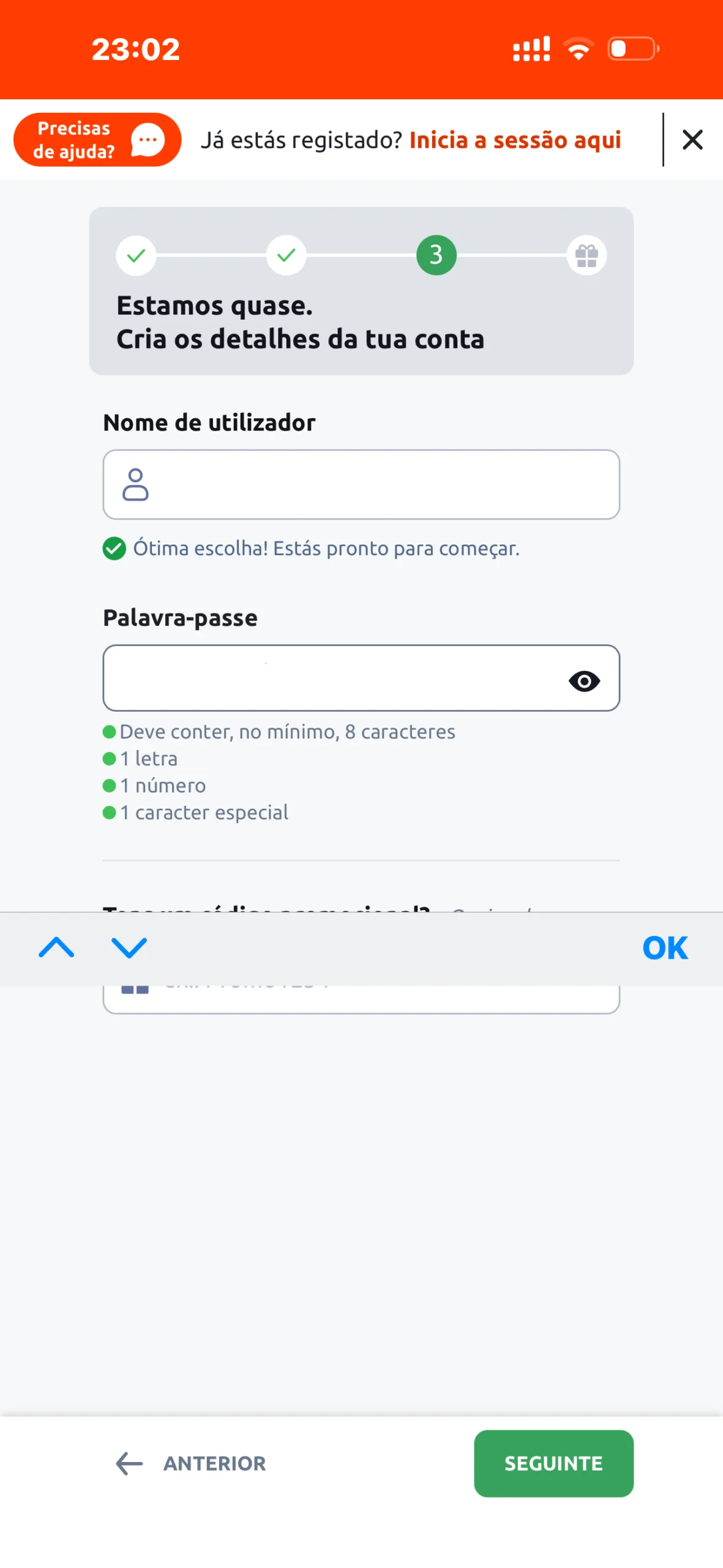 De seguida escolhes os dados de acesso à conta: nome de utilizador e palavra-passe;