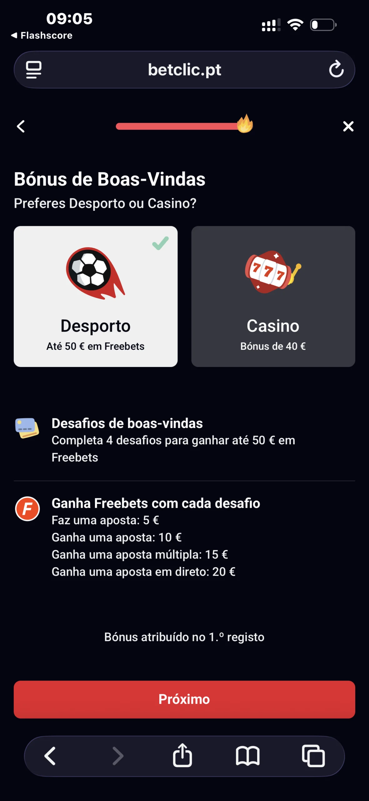 Sim; ao criar conta, podes receber uma aposta sem risco até 50€, a qual será atribuída após a realização de um prognóstico qualificável.