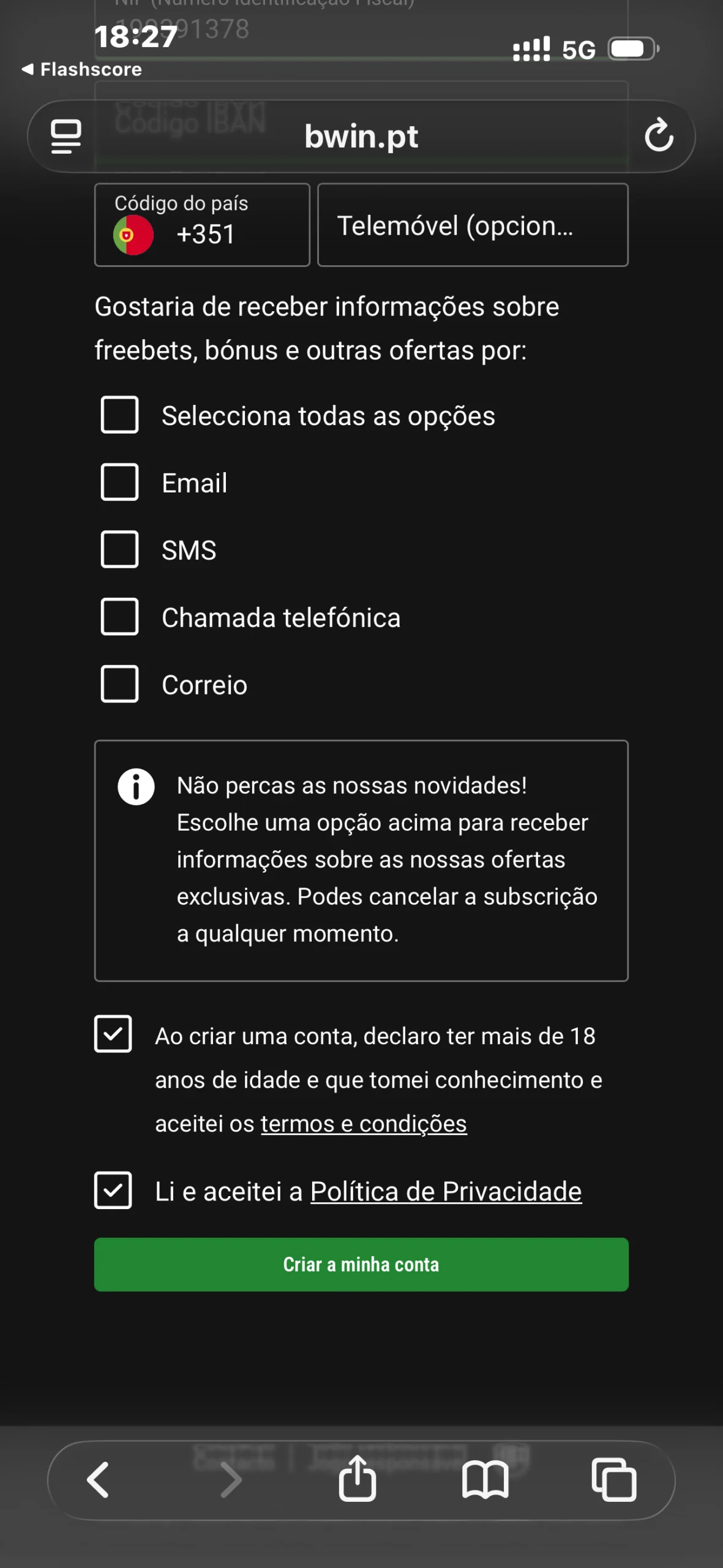 Conclui a criação da conta depois de aceitares a Política de Privacidade e os Termos e Condições da operadora