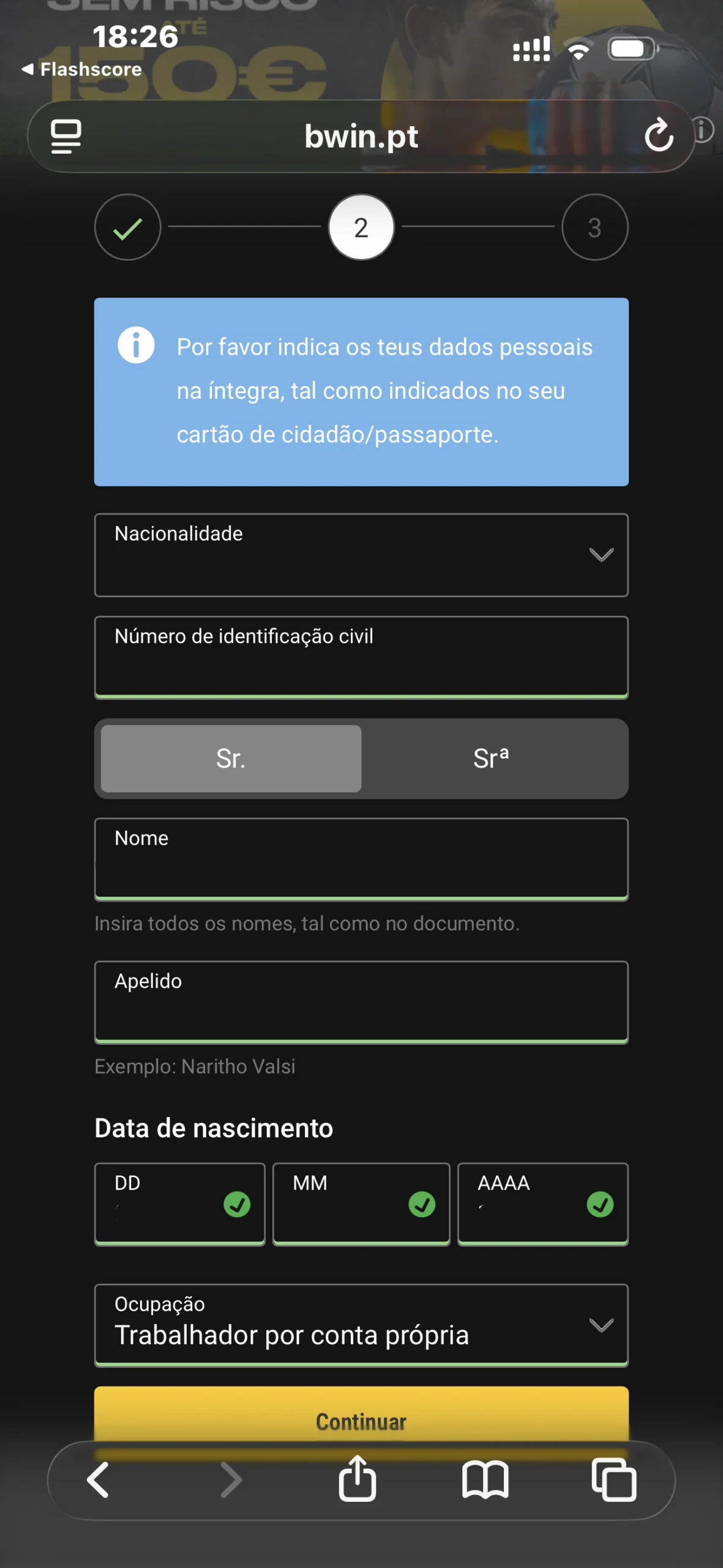 No segundo passo do registo, acrescenta o teu nome, apelido, nacionalidade, número do Cartão de Cidadão e profissão