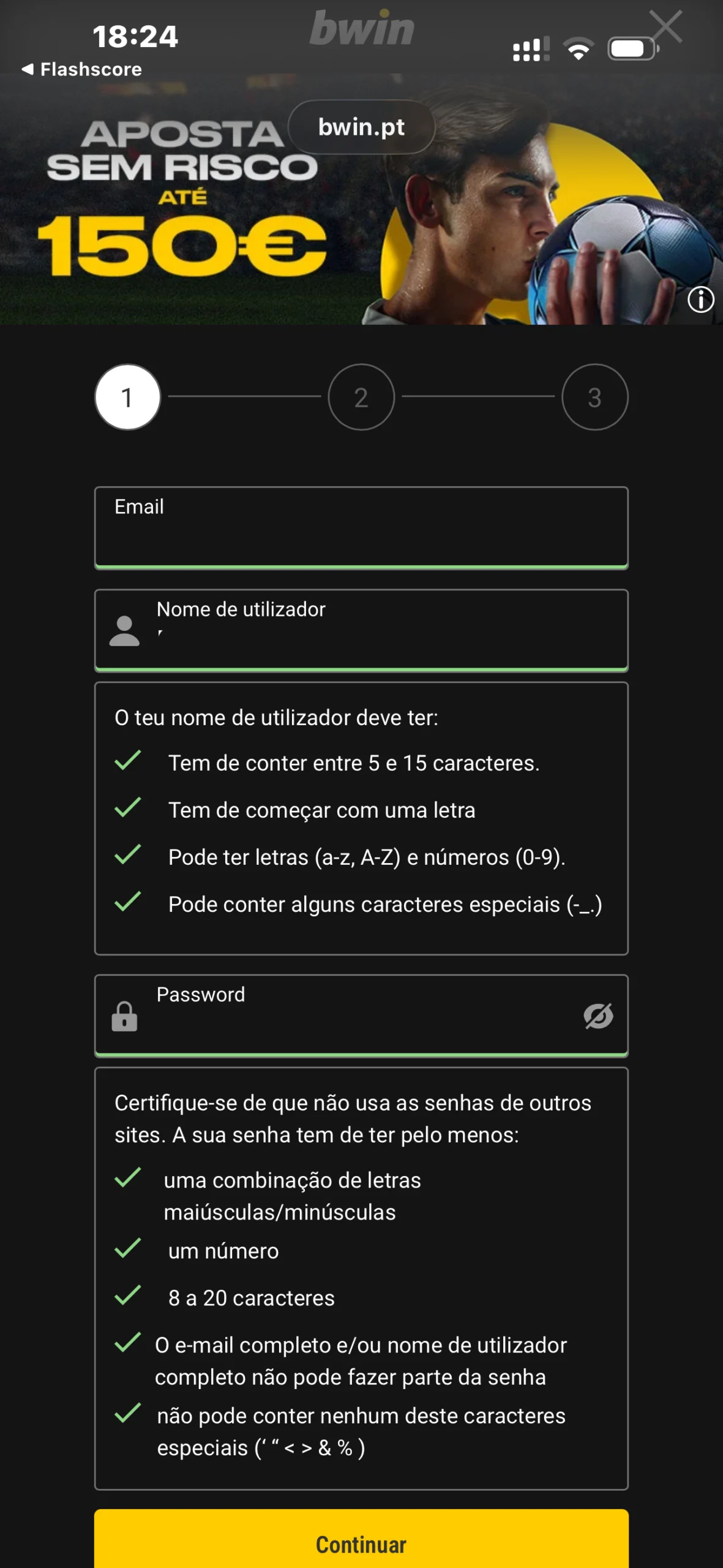 No momento do registo na Bwin, a plataforma indica a laranja e verde as informações corretas ou incorretas, mas apenas a fatores que consegue avaliar de antemão, como sendo um nome de utilizador com um número de caracteres insuficiente. Nesse sentido, é fundamental que confiras os dados pessoais que digitaste no formulário.