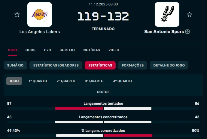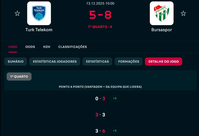Pretendes apostar no Mais/Menos em lançamentos de campo convertidos? Na secção de estatísticas de cada evento no Flashscore, consegues conferir as percentagens de acerto nos lançamentos, além dos totais de assistências, ressaltos, roubos de bola, sem esquecer os “turnovers” (perdas de bola) e faltas.