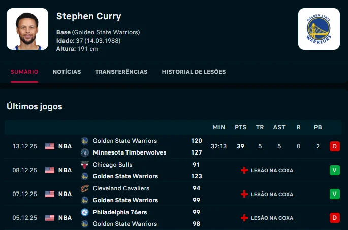 No Flashscore, tens acesso às performances recentes de cada jogador: clica ou toca num atleta para analisares os seus desempenhos nas últimas partidas, e a sua média de pontos por época. O historial de lesões pode ajudar-te a perceber se o atleta está em boa forma física, ou ainda em fase de recuperação, e por isso longe do seu melhor nível.
