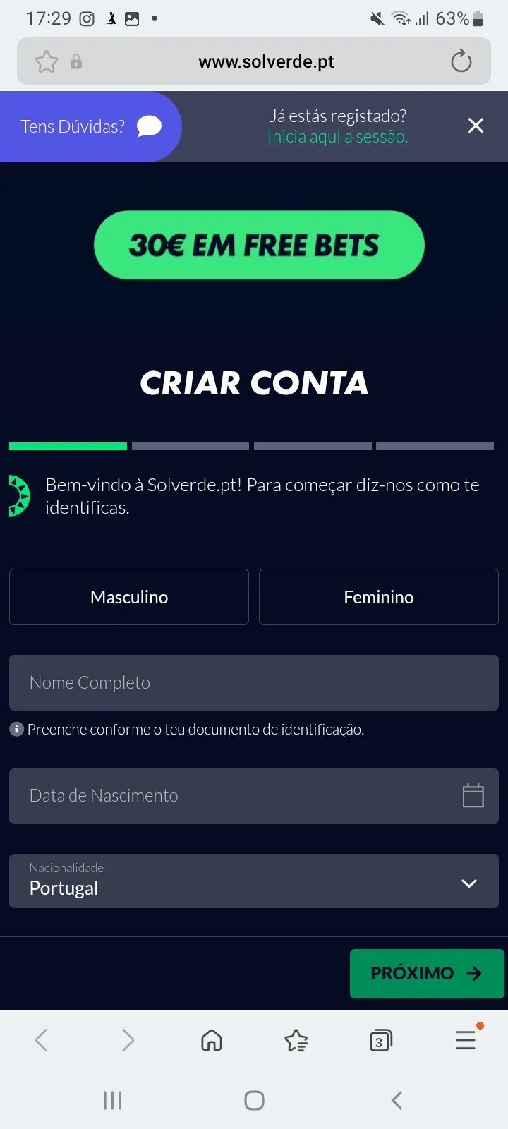 Para te registares na Solverde tens de ter mais de 18 anos, e residência em Portugal.