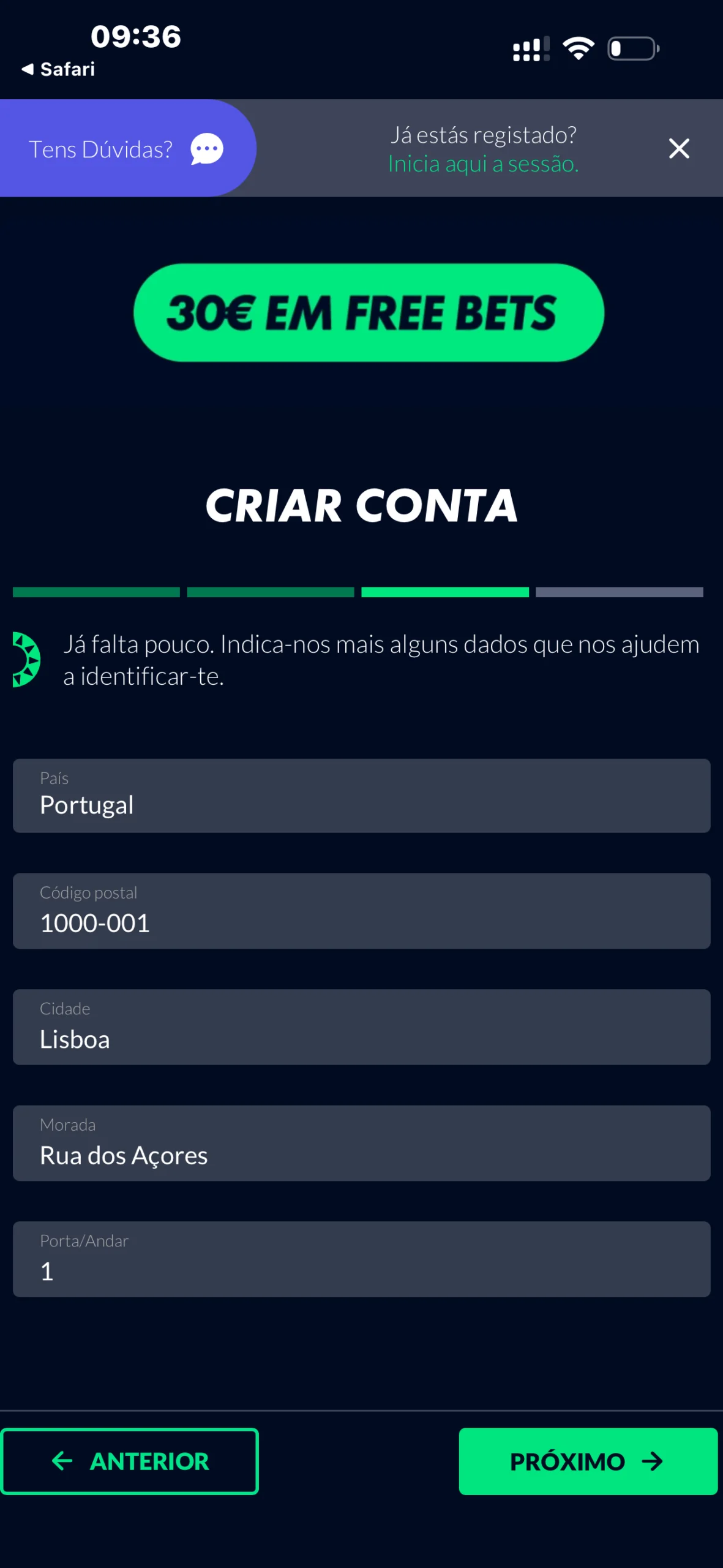 No ecrã seguinte preenche: Email, Número de telemóvel, Número Cartão de Cidadão, Número de Contribuinte, Morada e Código Postal