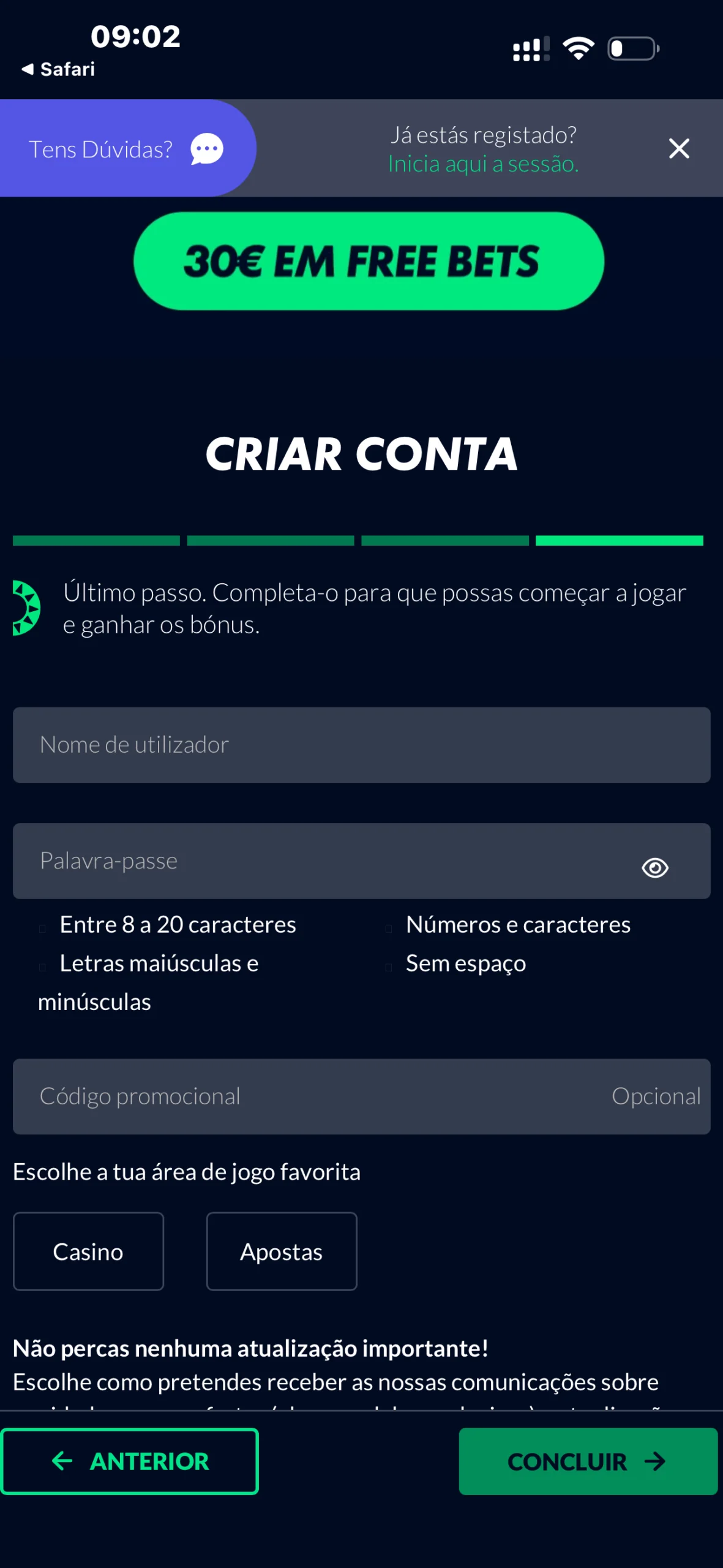 Para criares conta, clica em “Registar”, e no site ou na app da Solverde preenche o formulário dividido em quatro etapas com os teus dados pessoais, de contacto e acesso. No final, aceita os termos e clica em “Concluir”.